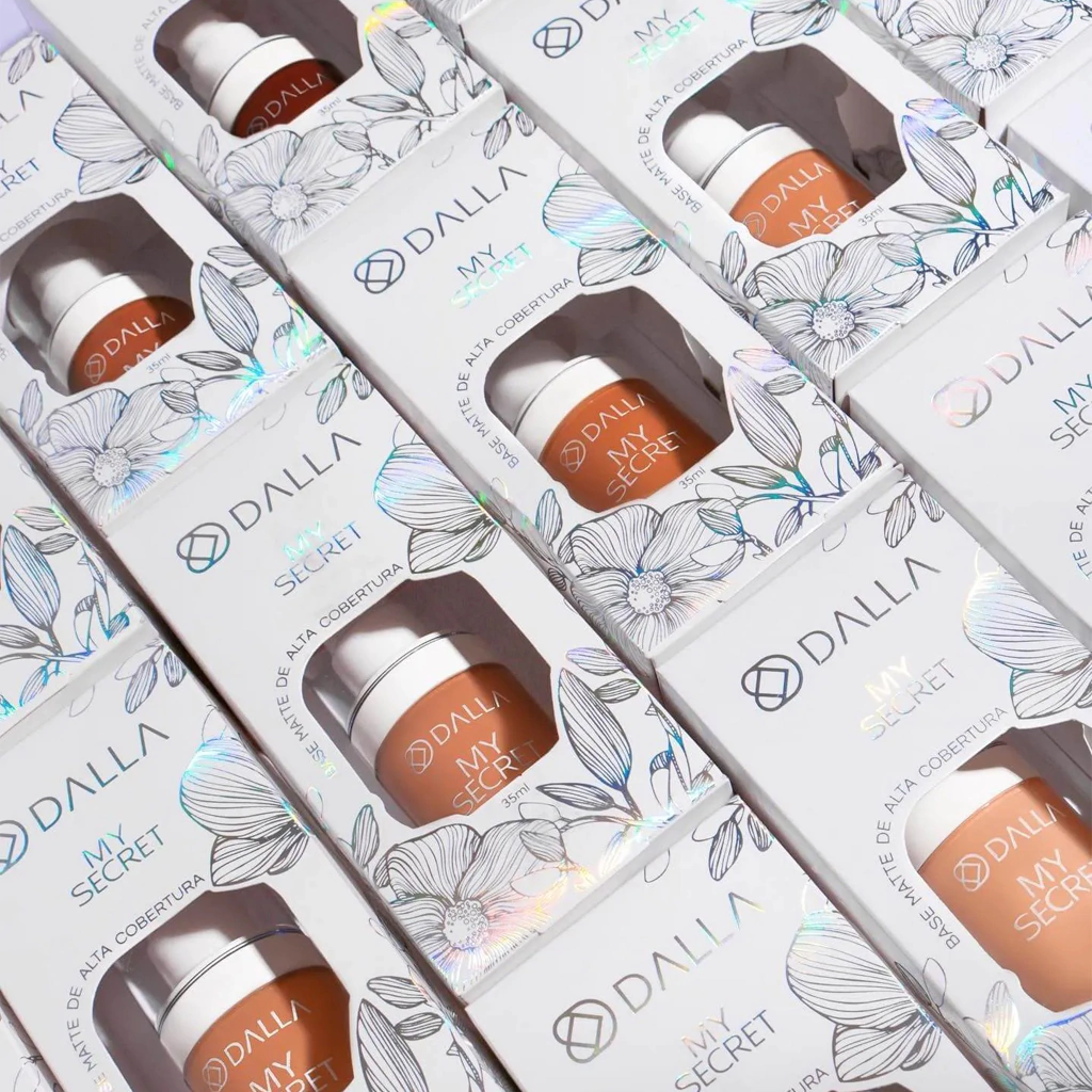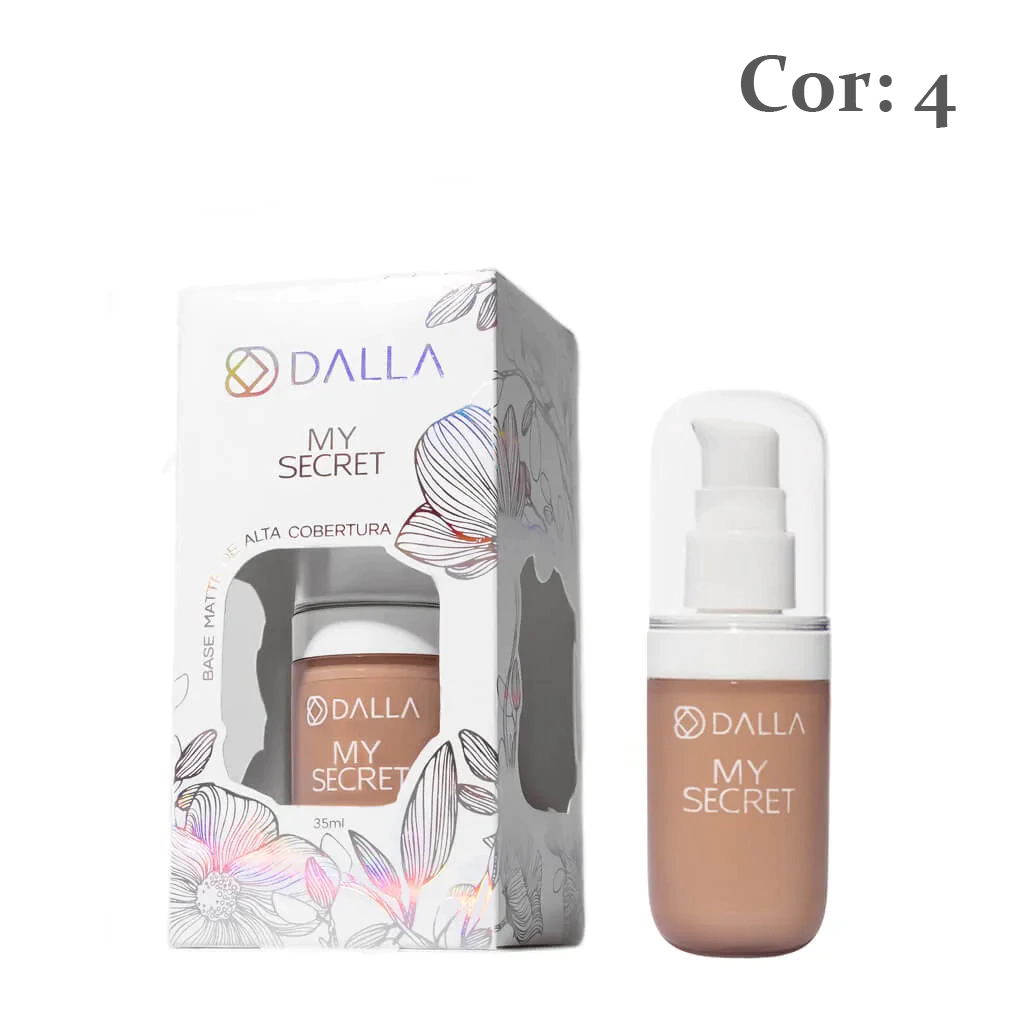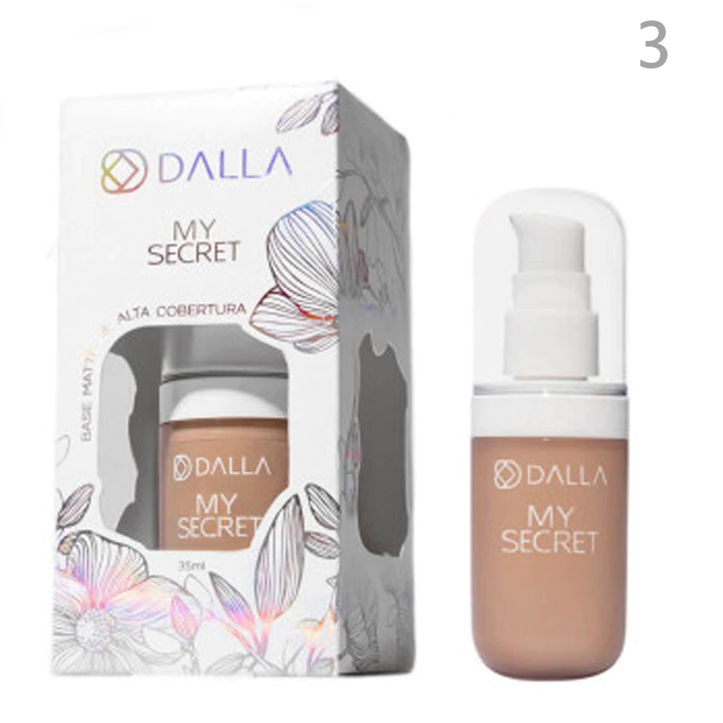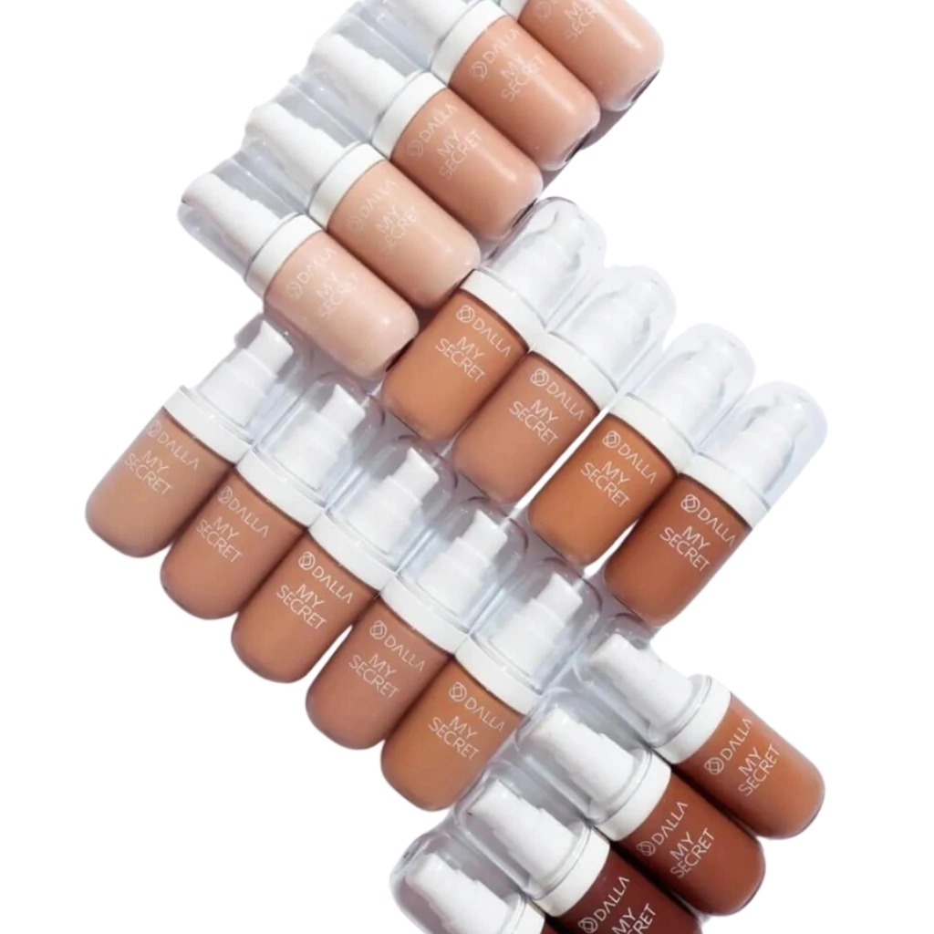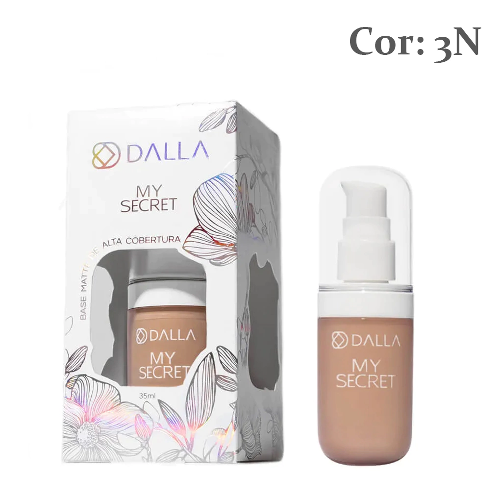 A Base Líquida de Alta Cobertura My Secret Dalla oferece uma pele perfeita com acabamento matte e natural, ideal para quem busca alta cobertura, longa duração e conforto ao longo do dia. Com textura fluida e fácil de espalhar, ela uniformiza o tom da pele, disfarça manchas, acne e imperfeições sem pesar ou craquelar.