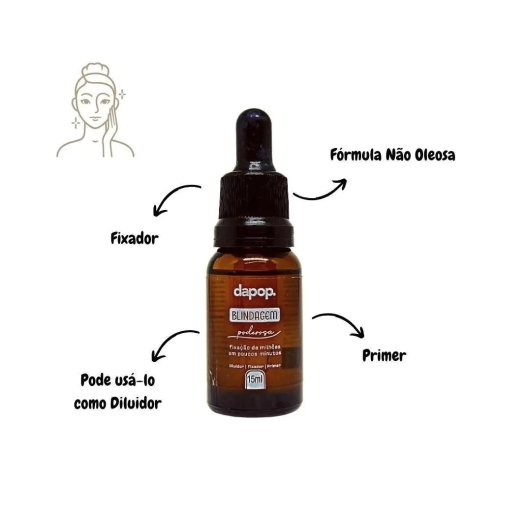 Com uma textura super líquida e não oleosa, a Blindagem Dapop proporciona uma sensação de pele hidratada. São apenas algumas gotinhas para diluir e recuperar produtos que ficaram ressecados, além de servir como primer na preparação da pele.