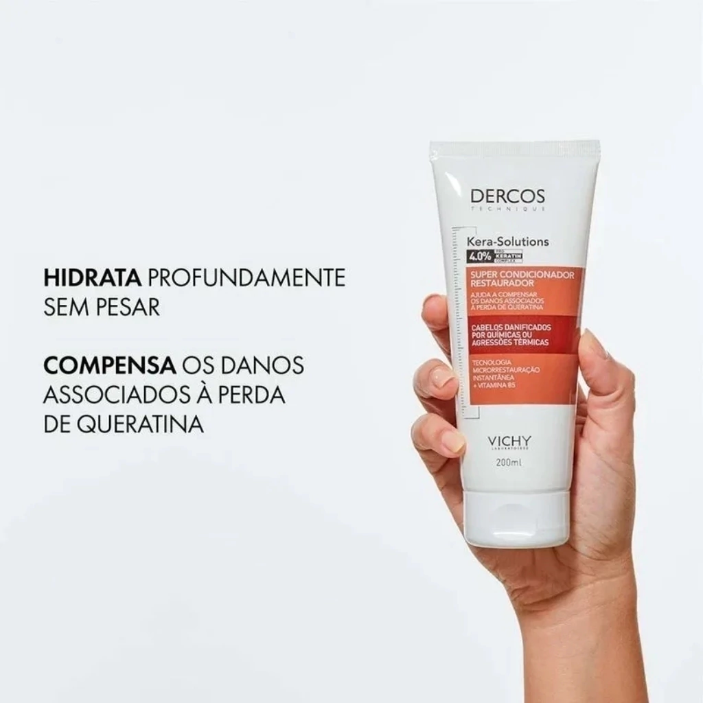 O Condicionador Vichy Dercos Kera-Solutions é indicado para cabelos danificados por químicas ou agressões térmicas, pois ele hidrata de forma profunda sem pesar, restaurando e fortalecendo a fibra capilar.