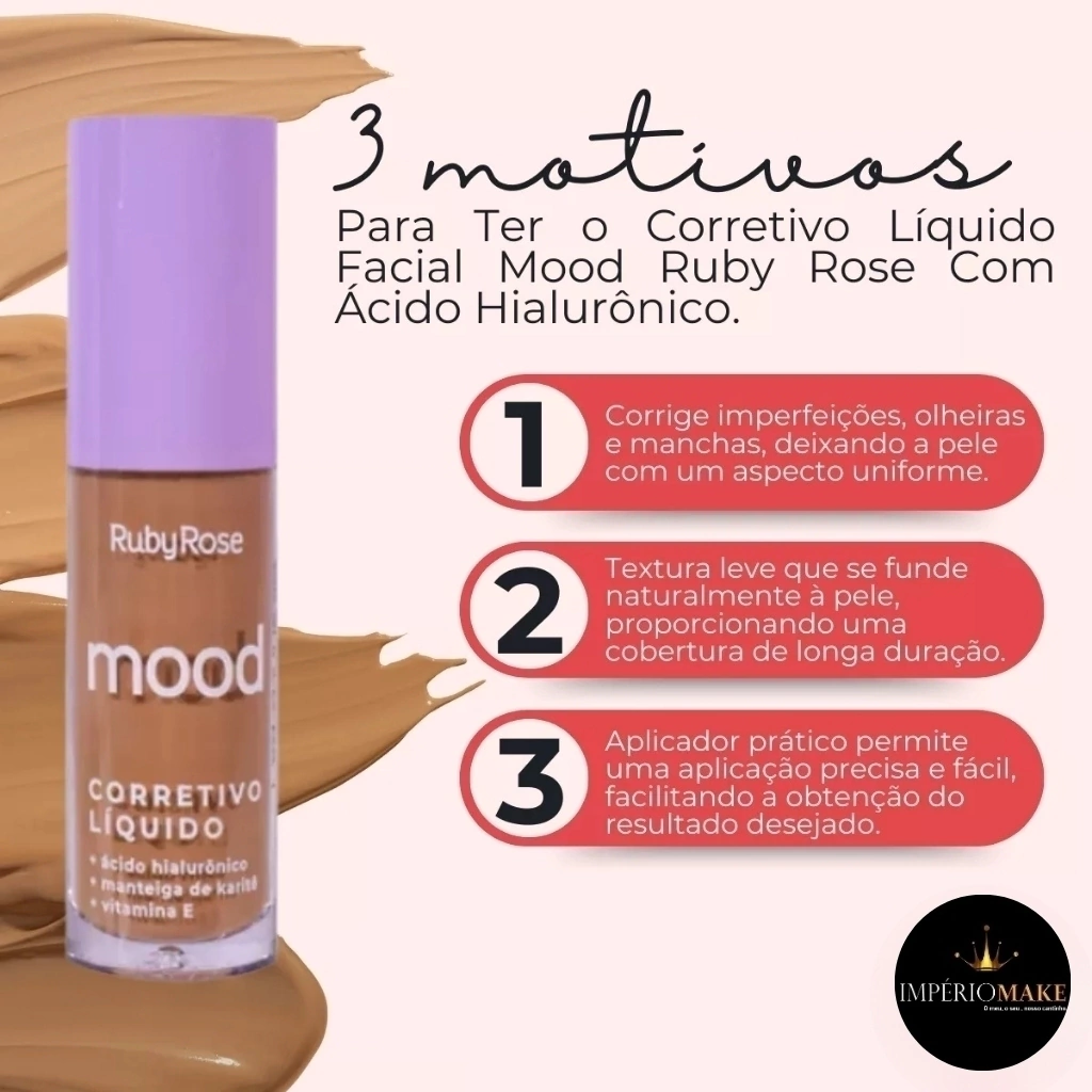 O Corretivo Líquido Ruby Rose Mood é a escolha perfeita para quem deseja camuflar olheiras, manchas e imperfeições com naturalidade e alta performance. Sua fórmula possui textura cremosa e cobertura média a alta, permitindo construir camadas sem pesar.