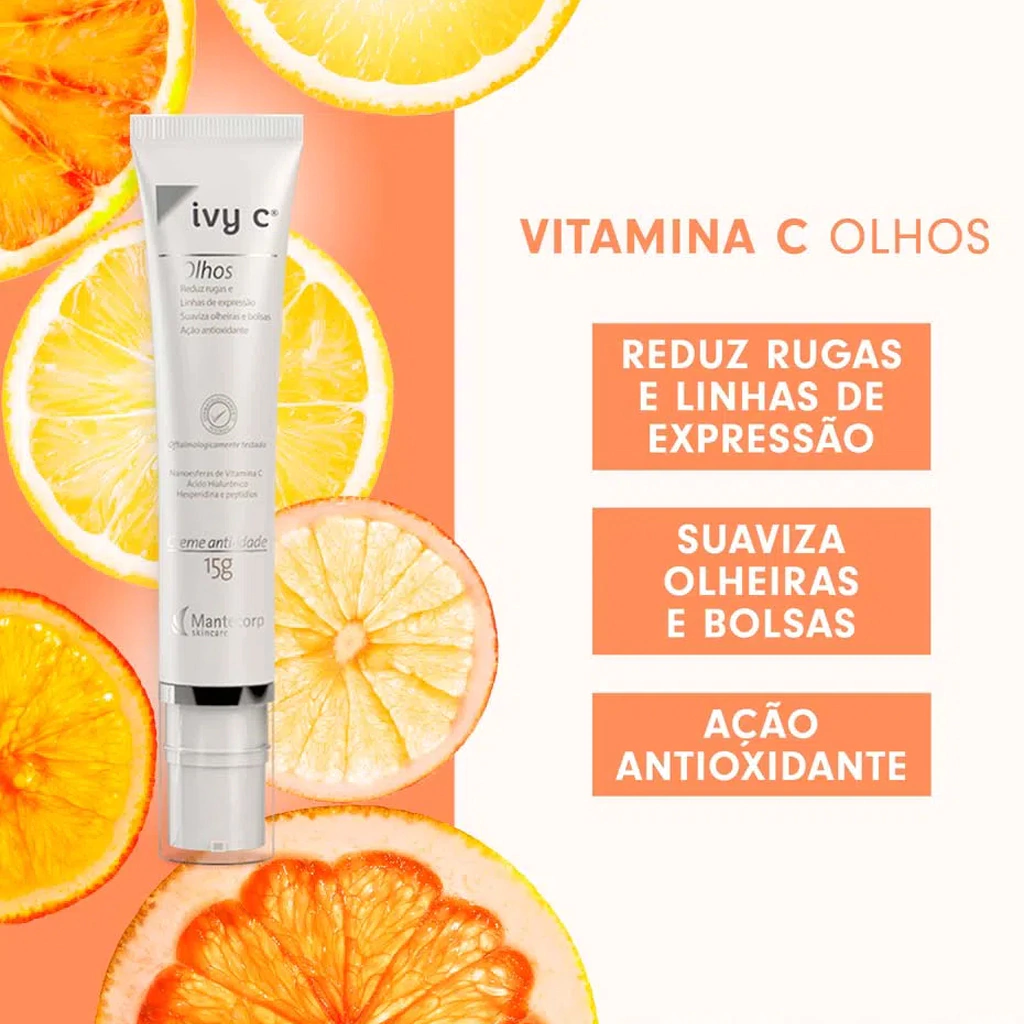 Descubra o Ivy C Olhos, um creme inovador que combina Vitamina C Nanoencapsulada, Ácido Hialurônico e Hesperidina com peptídeos, proporcionando uma ação rejuvenescedora profunda. Sua fórmula exclusiva garante que os ativos sejam entregues nas camadas mais profundas da pele, potencializando os resultados.