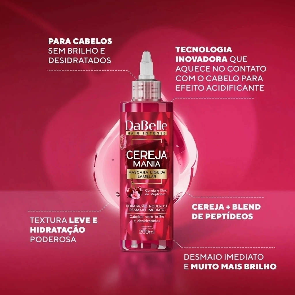 A Máscara Líquida Lamelar DaBelle Cereja Mania 200ml é um tratamento profundo com textura leve e inovadora, que potencializa a ação dos ativos para entregar uma hidratação intensa, alinhamento duradouro e brilho imediato.