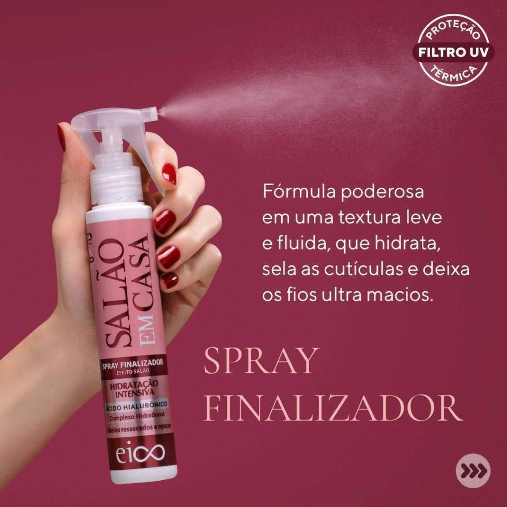 O Eico Spray Finalizador Salão Em Casa 120ml é o aliado perfeito para quem deseja cabelos com aspecto profissional sem sair de casa. Com fórmula leve e eficaz, ele proporciona controle do frizz, proteção térmica contra secador, chapinha e babyliss, além de brilho intenso e toque sedoso. Indicado para todos os tipos de cabelo, ele facilita o desembaraço, alinha os fios e mantém o visual impecável durante todo o dia.