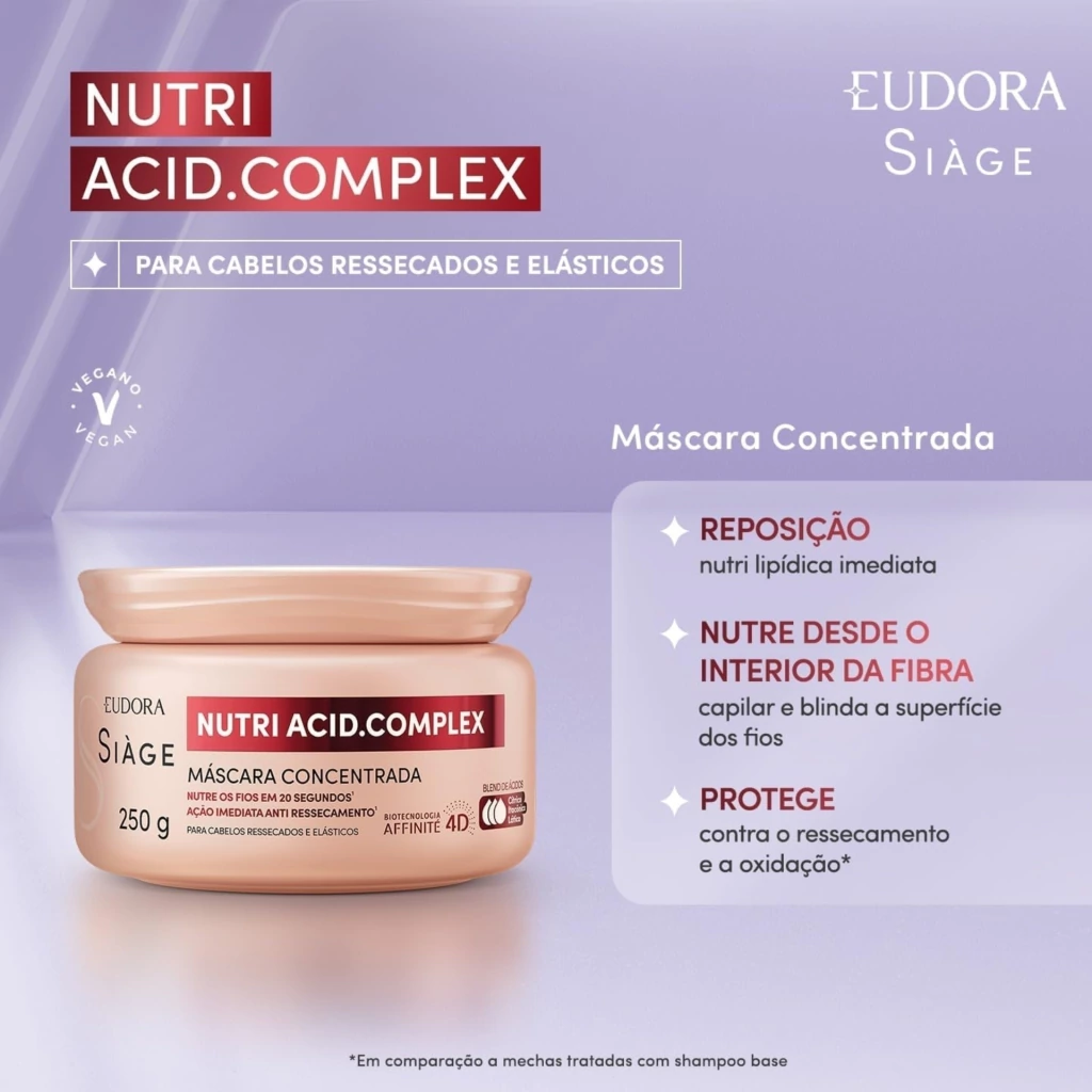 A Máscara Capilar Concentrada Eudora Siàge Nutri Acid.Complex 250g é o tratamento ideal para quem busca nutrição intensa, brilho e restauração completa dos fios. Desenvolvida com a exclusiva tecnologia Nutri Acid.Complex, sua fórmula combina ácidos nutritivos e lipídios essenciais que atuam de dentro para fora, reparando a fibra capilar e devolvendo a vitalidade perdida.