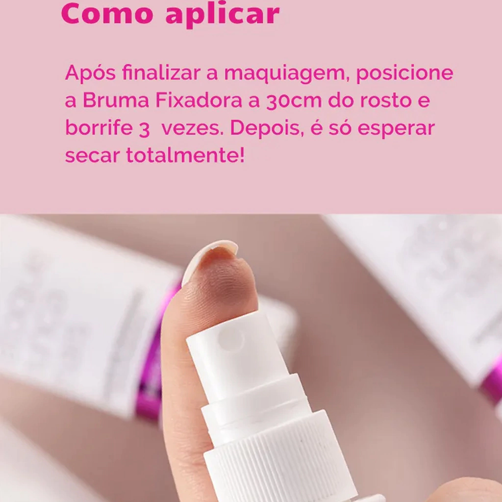 Feche os olhos e borrife a bruma em movimentos de “X” e “T”, mantendo uma distância de 25 a 30 cm do rosto. Aguarde alguns segundos para absorção.