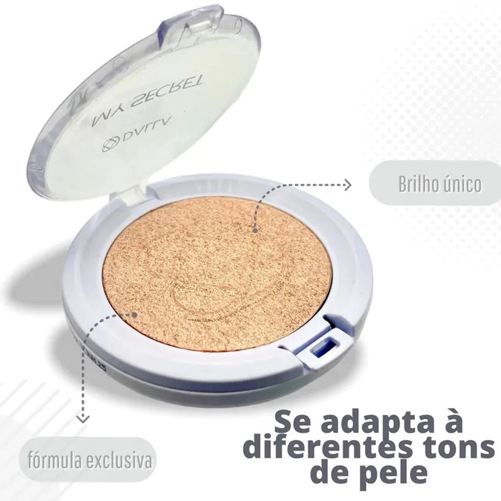 Fácil de aplicar e espalhar, o iluminador My Secret Dalla se adapta a todos os tons de pele, conferindo um toque sofisticado e moderno ao visual. Seu formato compacto é prático para levar na bolsa e retocar durante o dia ou à noite.