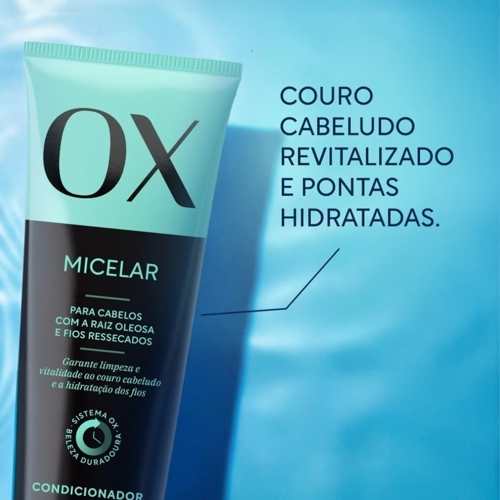 A Linha OX Micelar é a ideal para cabelos com raiz oleosa e pontas secas. Isso porque a combinação da Água Micelar e Água Termal, com o Sistema OX Beleza Duradoura, é a fórmula certa para um couro cabeludo limpo e revitalizado mantendo as pontas hidratadas por muito mais tempo. Rico em minerais, com propriedades antimicrobiano, adstringente, estimulante, hidratante, refrescante, tonificante agindo por até 120 horas nos cabelos.