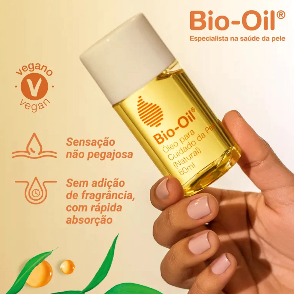 O Óleo Natural para Cuidado da Pele de Bio Oil é 100% Natural e Sem Adição de Fragrância que auxilia a melhorar e prevenir a aparência das estrias, cicatrizes, manchas por hiperpigmentação e sinais da idade (linhas de expressão e rugas).