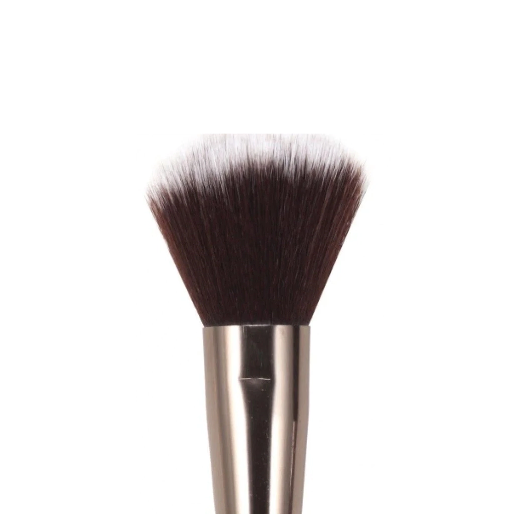Pincel Macrilan B112 especialmente desenvolvido para aplicação de pó mineral, pó facial compacto, solto ou iluminador por toda a face e corpo. Feito com cerdas arredondadas e macias para uma aplicação suave e uma maquiagem uniforme.
