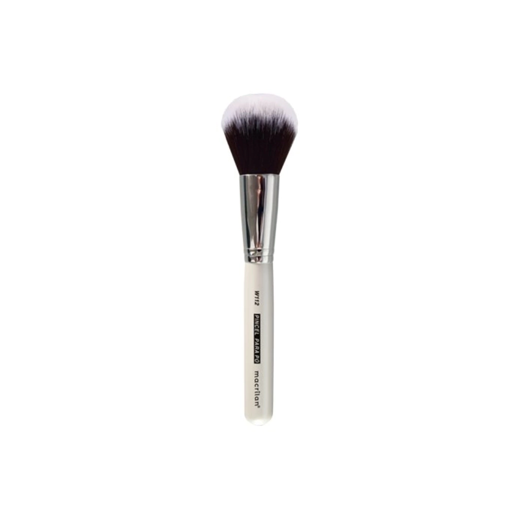 Pincel Macrilan W112 especialmente desenvolvido para aplicação de pó mineral, pó facial compacto, solto ou iluminador por toda a face e corpo. Feito com cerdas arredondadas e macias para uma aplicação suave e uma maquiagem uniforme.