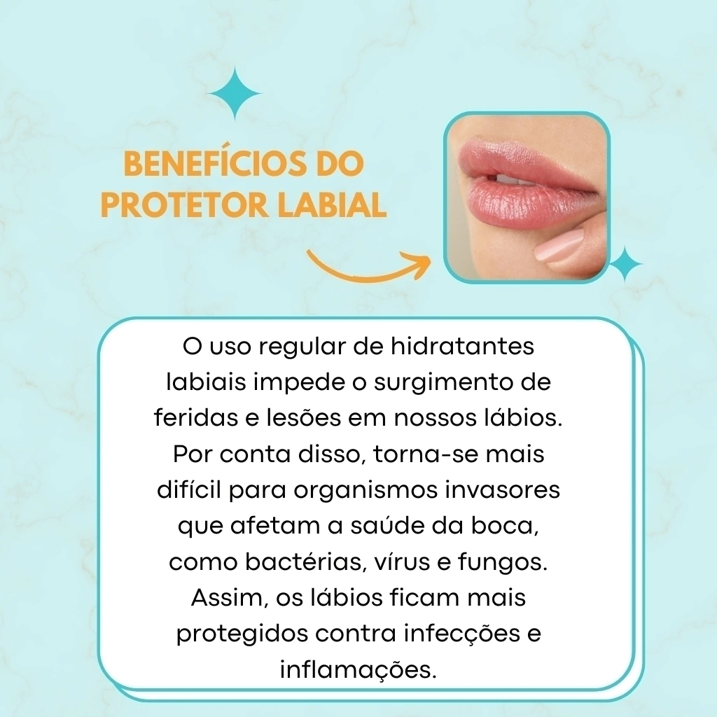 Com FPS30, ele protege contra os raios UVA e UVB, preservando a saúde da pele dos lábios enquanto garante maciez e suavidade. Leve e prático, pode ser usado diariamente, sozinho ou antes do batom, deixando seus lábios sempre bonitos, protegidos e confortáveis.