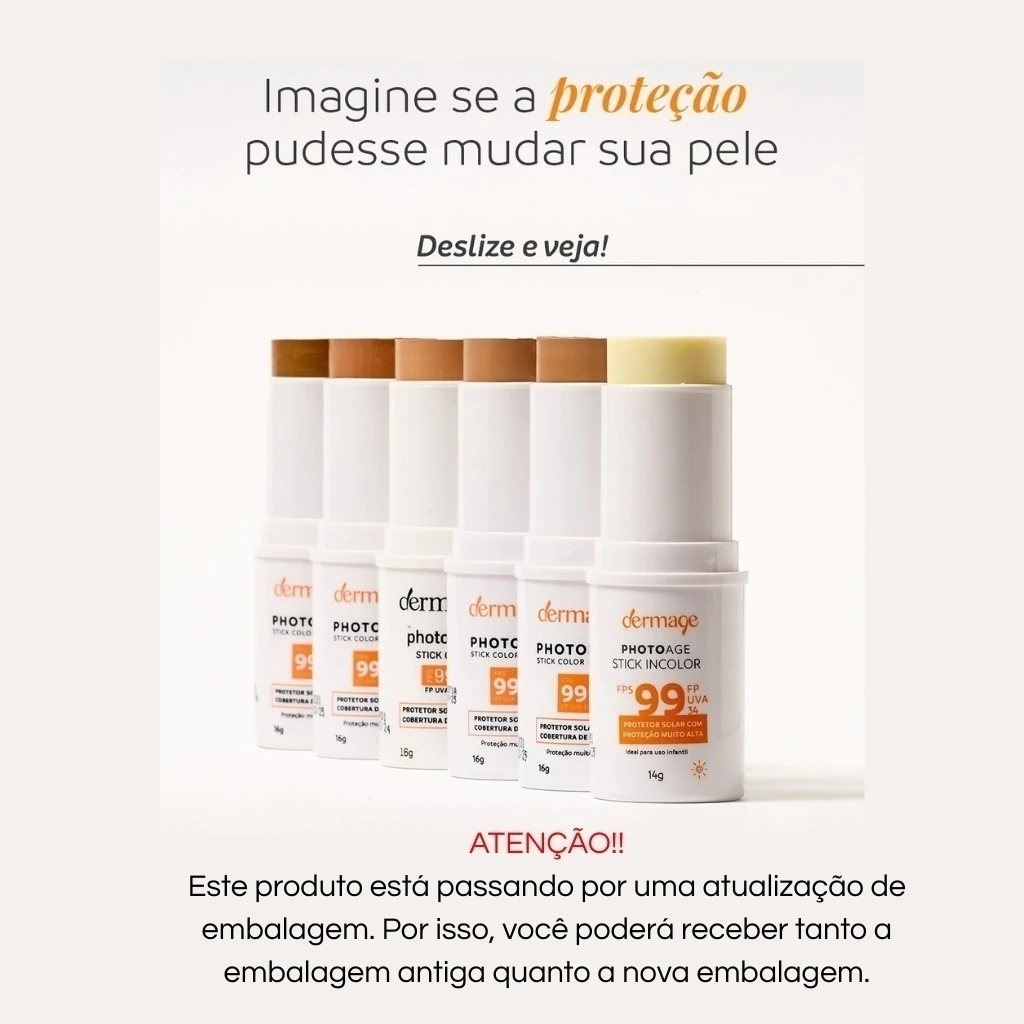 O Protetor Solar Dermage Photoage Stick FPS99 oferece proteção muito alta contra os raios UVA e UVB, ajudando a prevenir o envelhecimento precoce e manchas solares. Com formato em bastão prático e portátil, é perfeito para reaplicar ao longo do dia, inclusive sobre a maquiagem. Possui textura leve, não oleosa e transparente, garantindo conforto, sem deixar resíduos brancos na pele. Dermatologicamente testado, é indicado para todos os tipos de pele, inclusive as mais sensíveis.