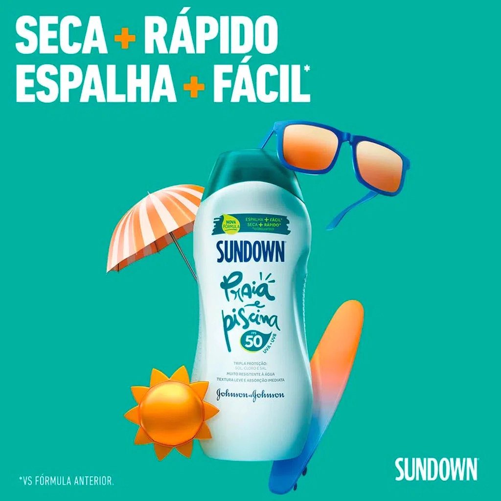 O Protetor solar Sundown Praia e Piscina FPS 50; com tripla proteção, ajuda a proteger a pele de elementos agressores como o sol, cloro e a água salgada do mar. Oferece proteção imediata uva + uvb, protegendo a pele de queimaduras solares dentro e fora d'água. É três vezes mais resistente à água e ao suor e seguro para uso em toda família. Proteção completa para curtir a vida ao ar livre; uva + uvb balanceado; resistente à água por 2 horas; hidratação prolongada; fotoestável: mesma proteção durante todo o tempo de exposição ao sol