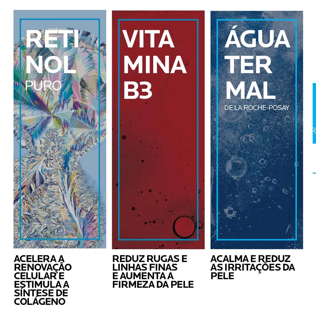 Com formulação exclusiva, ele combina Retinol Puro, Vitamina B3 e Água Termal de La Roche-Posay, para reduzir rugas acentuadas, uniformizar a textura da pele, combater o fotoenvelhecimento e devolver a firmeza, em uma textura sérum, não oleosa e de rápida absorção.