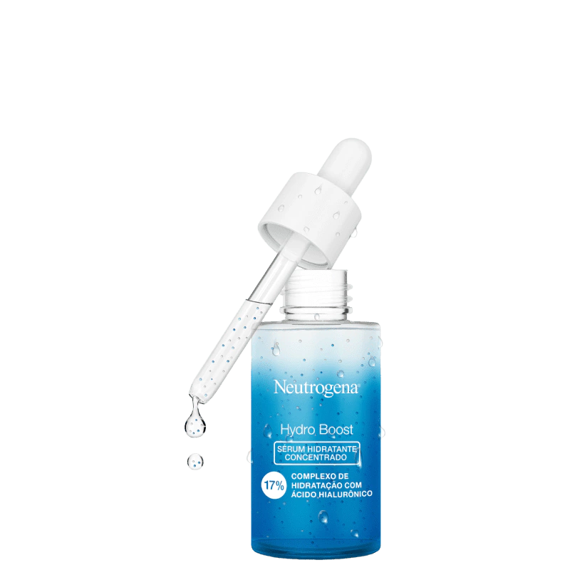 Sérum hidratante facial. Neutrogena Hydro Boost combina dois tamanhos de Ácido Hialurônico e Glicerina que penetram 9 camadas superficiais da pele.