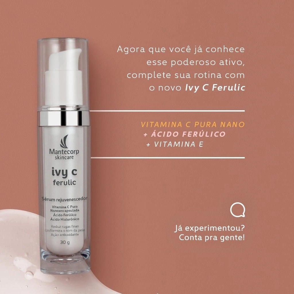 O Sérum Rejuvenescedor Mantecorp Ivy C Ferulic indicado para todos os tipos de pele, sua textura leve não deixa sensação pegajosa ou oleosa. Sua fórmula é enriquecida com tripla ação antioxidante com Vitamina C Pura Nanoencapsulada, Ácido Ferúlico e Ácido Hialurônico, a ação da da Vitamina C é constante e a liberação no rosto é prolongada por até 8 horas.