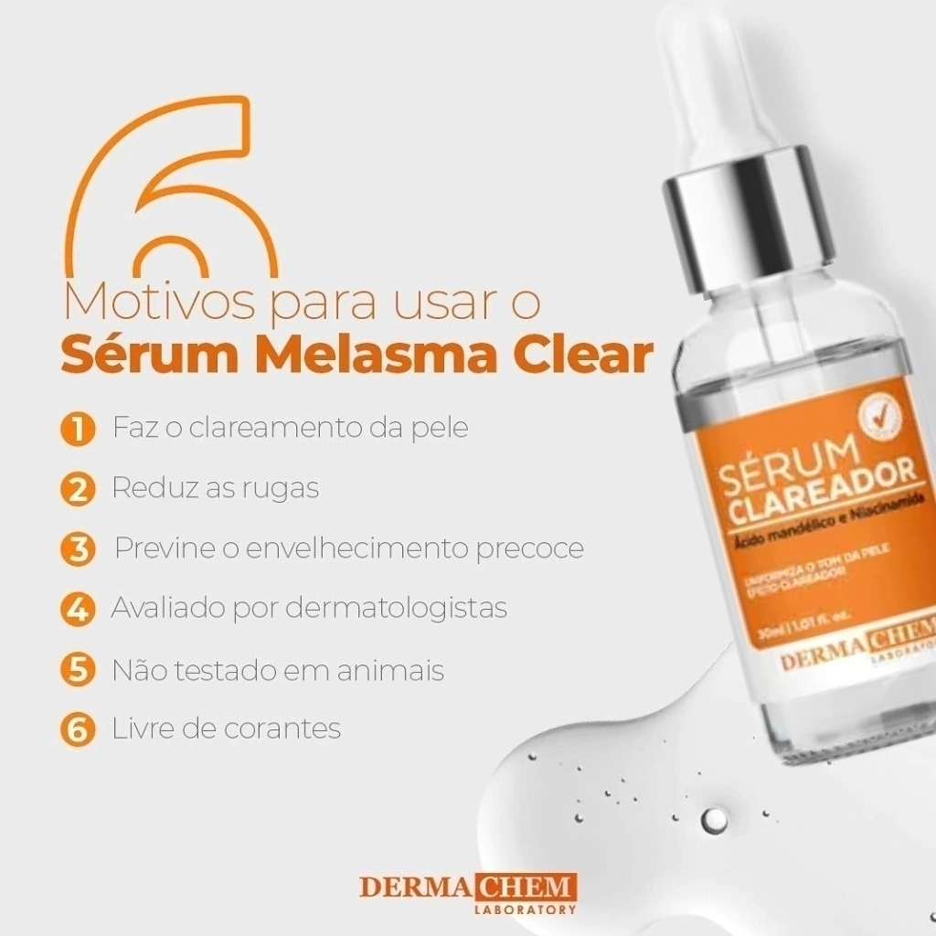 O Sérum Melasma Clear 30ml Dermachem é um tratamento facial desenvolvido para reduzir manchas, uniformizar o tom da pele e prevenir a hiperpigmentação. Sua fórmula concentrada contém ativos eficazes que auxiliam na diminuição de melasma e outras marcas, proporcionando uma pele mais uniforme, luminosa e saudável. Ideal para uso diário, ajuda a manter a pele hidratada e protegida, prevenindo o surgimento de novas manchas.