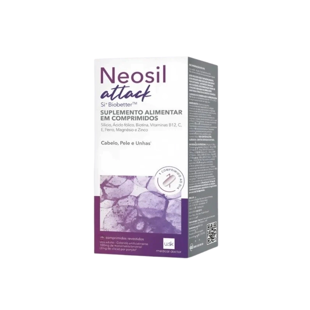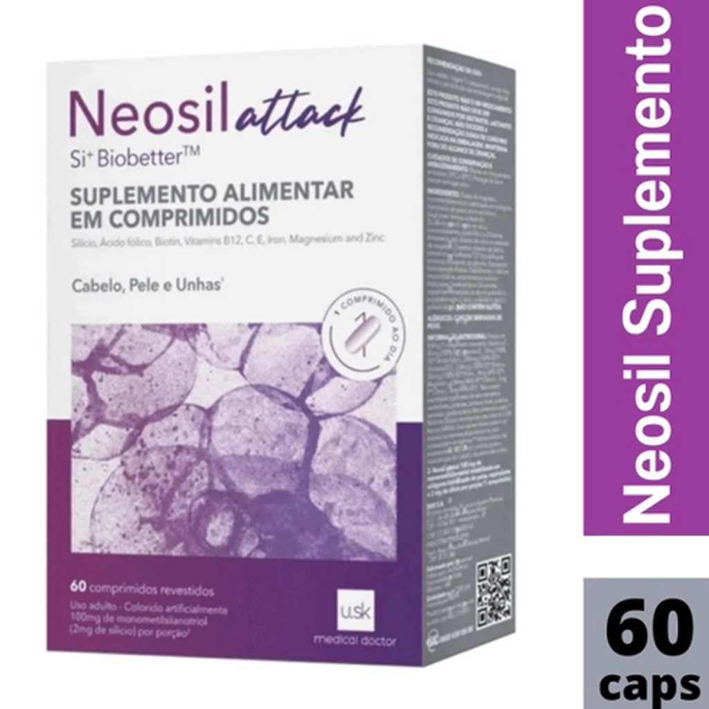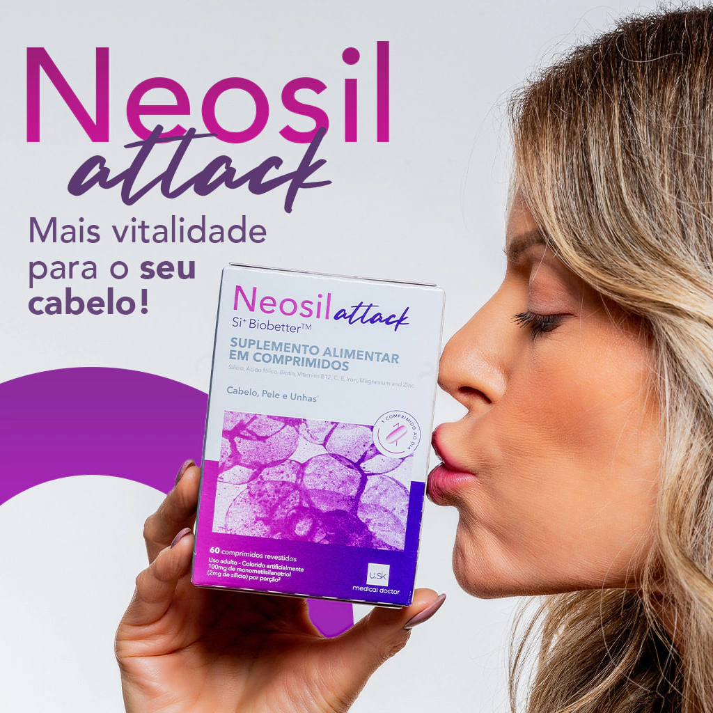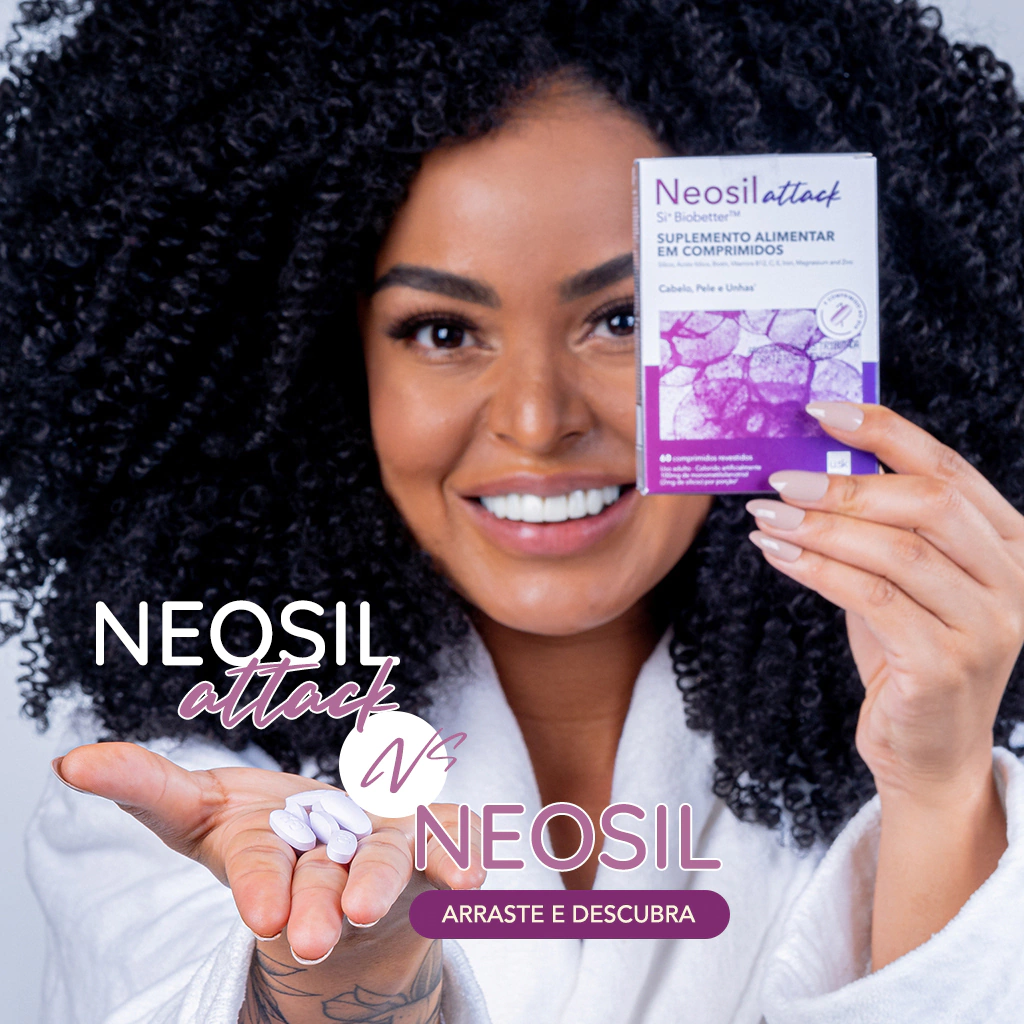O Neosil Attack é um suplemento alimentar em comprimidos desenvolvido pela Under Skin, cuja fórmula contém Si+Biobetter, uma combinação exclusiva de Silício com Colágeno, além de Ácido Fólico, Biotina, Ferro, Magnésio, Zinco e Vitaminas B12, C e E. Juntos, esses ativos atuam de diferentes formas, auxiliando nos cuidados com a pele, unhas e cabelo. Confira: