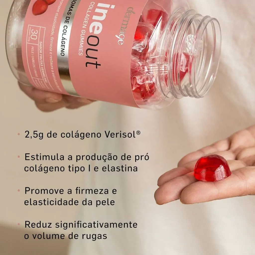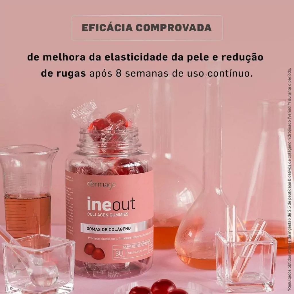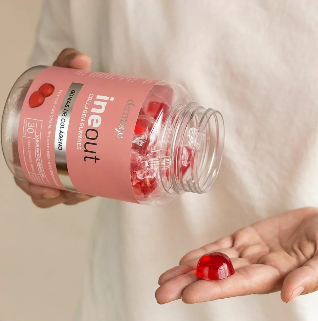 Suplemento em gomas com 2,5g de peptídeos bioativos de colágeno (Verisol) para pele, unhas e cabelos. Ineout Collagen Gummies promove elasticidade, firmeza e restaura a estrutura da pele.