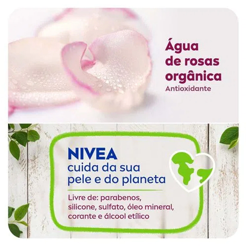 Contém extrato natural de rosa, conhecido por suas propriedades calmantes e antioxidantes.