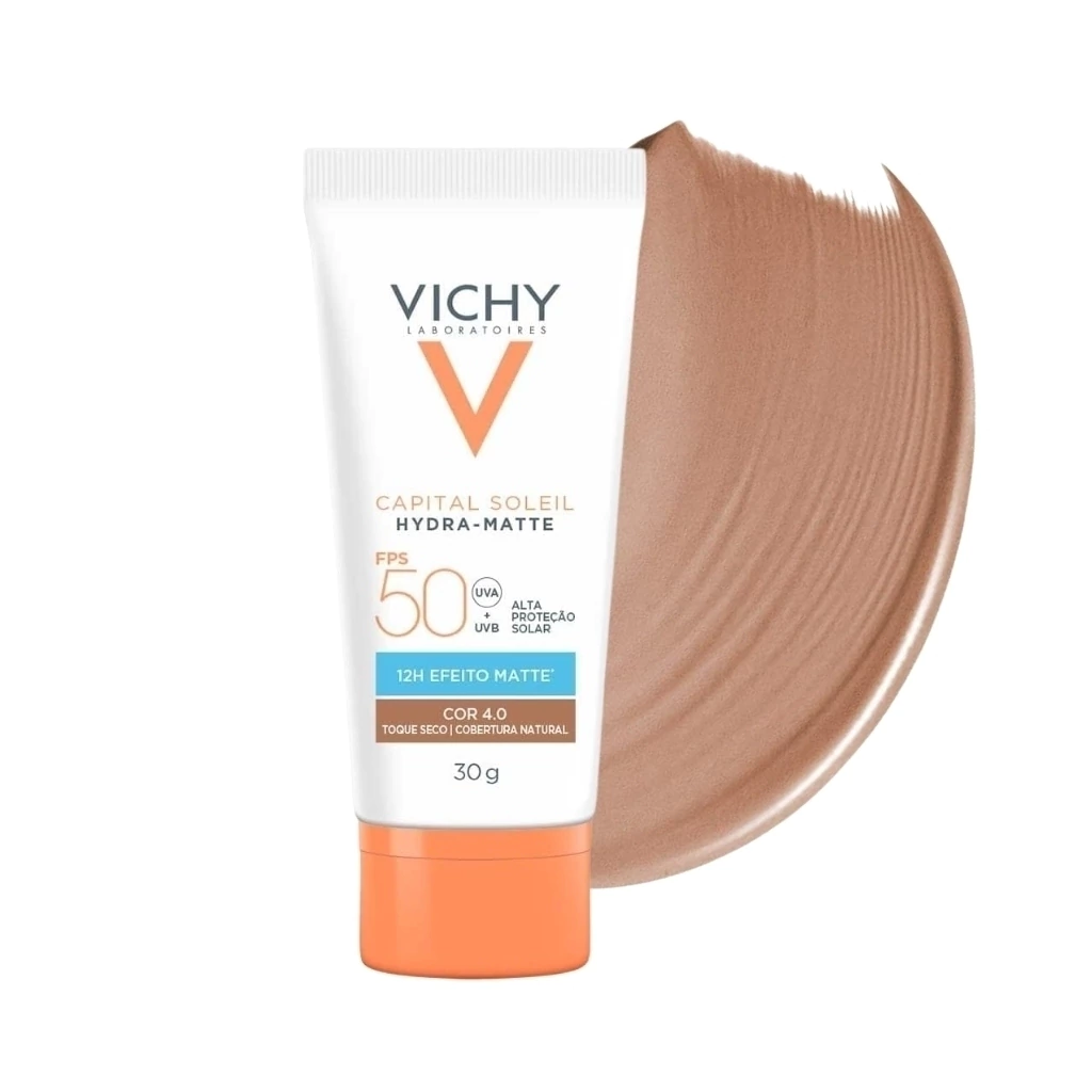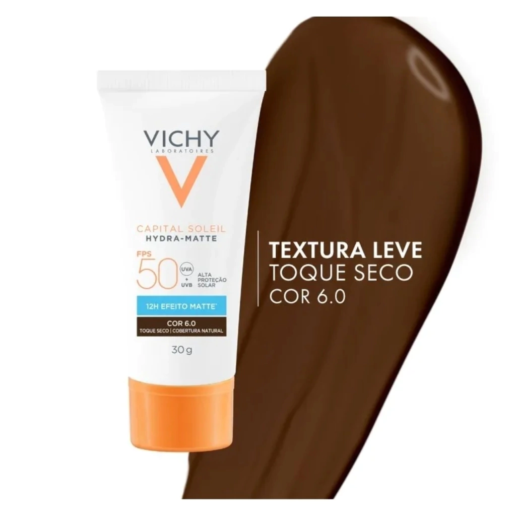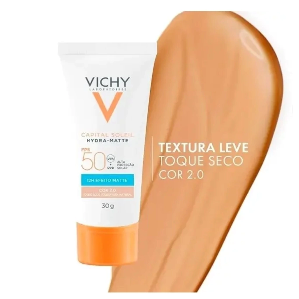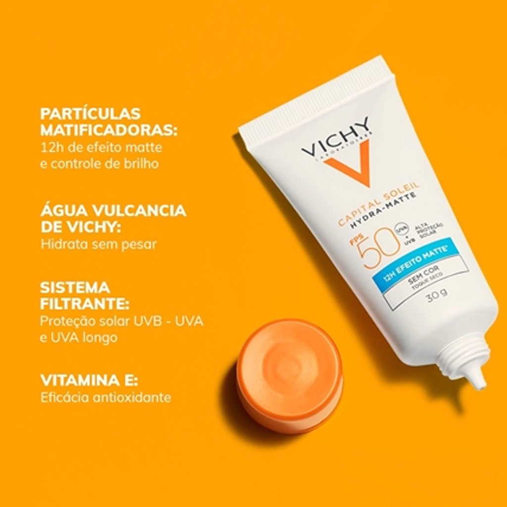 Vichy Capital Soleil Hydra-Matte Sem Cor FPS 50 30ml sem deixar brilho residual, deixando um efeito matte por até 12 horas, hidratando sem pesar. Satisfação e eficácia garantida por especialistas em textura e pacientes brasileiras com pele mista a oleosa.